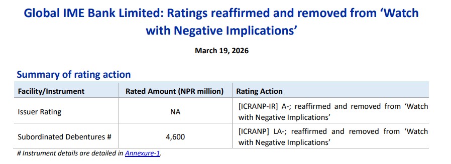 काठमाडौँ । ग्लोबल आइएमई बैंक लिमिटेडको जारीकर्ता रेटिङ पुनः पुष्टि गर्दै निगेटिभ वाचबाट हटाएको छ । रेटिङ एजेन्सि इक्रा नेपालले बैंकको जारीकर्ता रेटिङ ए माइनस कायम राखेको हो ।