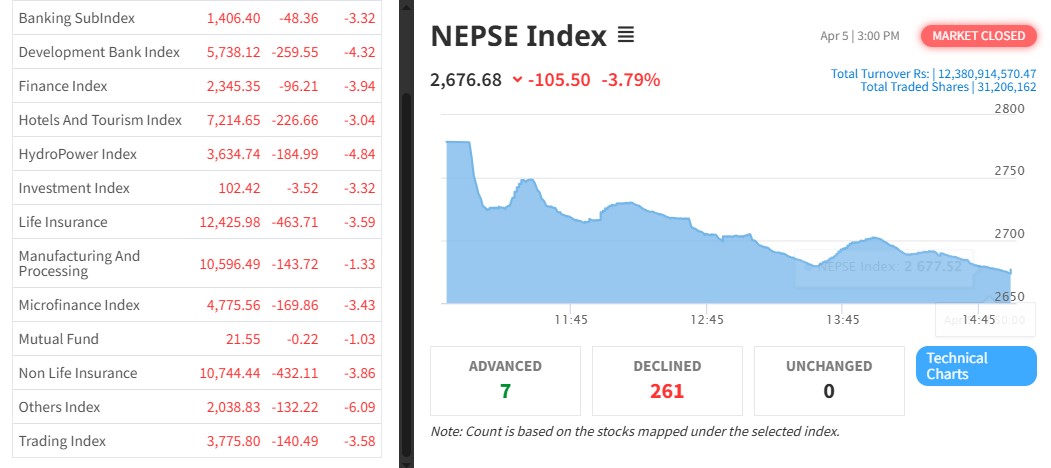 नेपाल स्टक एक्सचेञ्ज (नेप्से) १०५.५० अकंले घटेर २६७६.६८ बिन्दुमा कायम भएको छ । आज ३४५ कम्पनीको ३ करोड १२ लाख ६ हजार कित्ता शेयर किनबेच हुँदा १२ अर्ब ३८ करोड ९ लाख १४ हजार रुपैयाँको कारोबार भएको हो ।