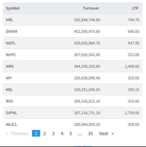 त्यस्तै, शिवम सिमेन्टस, नाग्दी पावर, नेशनल हाईड्रोपावर, एनआरएन इन्फ्रास्टक्चर, अपी पावर, कुमारी बैंक, रिदि पावर, एसवाई प्यानल र आँखु खोलाको सर्वाधिक कारोबार भएको छ।