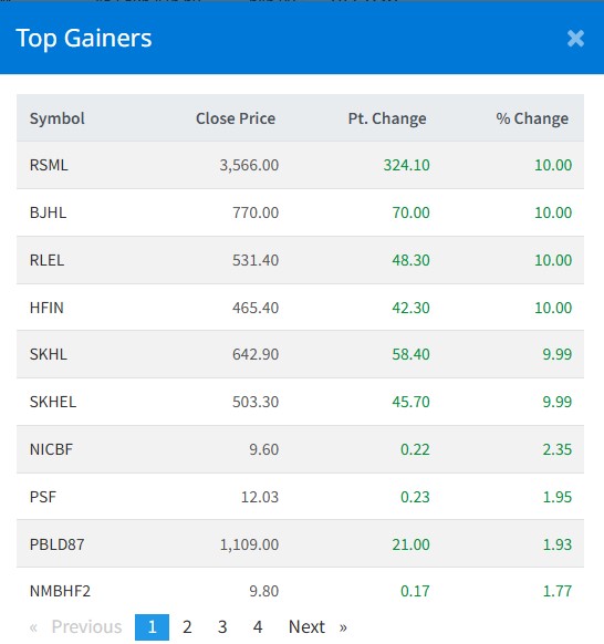 काठमाडौँ । शेयर बजारमा भारी गिरावट आएपनि केहि कम्पनीको शेयर मूल्यमा भने सकारात्मक सर्किट लागेको छ । नेपाल स्टक एक्सचेञ्ज (नेप्से) १०५.५० अकंले घटेर २६७६.६८ बिन्दुमा कायम भएको हो ।