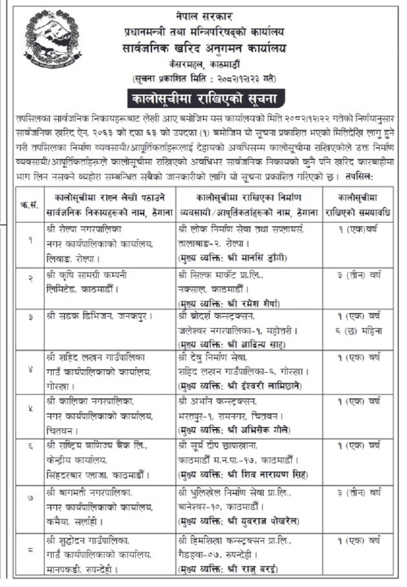 काठमाडौँको सिल्क मार्केट प्रालि र बागमती नगरपालिका, सर्लाहीको सिफारिसमा काठमाडौँको धुलिखेल निर्माण सेवा प्रालि तीन वर्षका लागि कालोसूचीमा परेका छन्। महोत्तरीको ब्रदर्स कन्स्ट्रक्सनलाई सडक डिभिजन, जनकपुरको सिफारिसमा एक वर्ष छ महिनाका लागि प्रतिबन्ध लगाइएको छ।