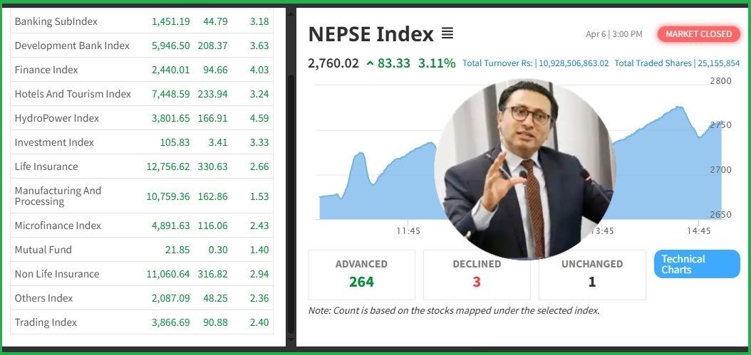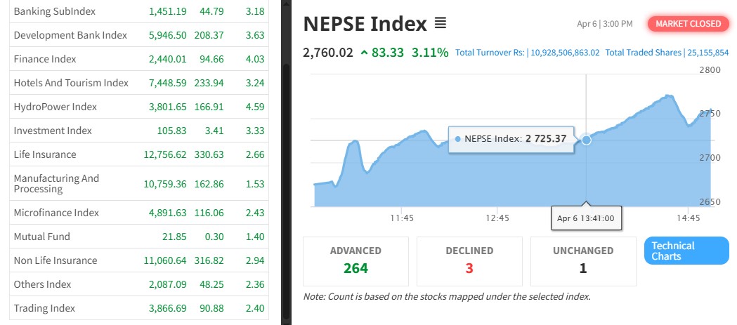 नेपाल स्टक एक्सचेञ्ज (नेप्से) ८३.३३ अकंले बढेर २७६०.०२ बिन्दुमा कायम भएको छ । आज ३४५ कम्पनीको २ करोड ५१ लाख कित्ता शेयर किनबेच हुँदा १० अर्ब ९२ करोडको कोरोबार भएको छ ।