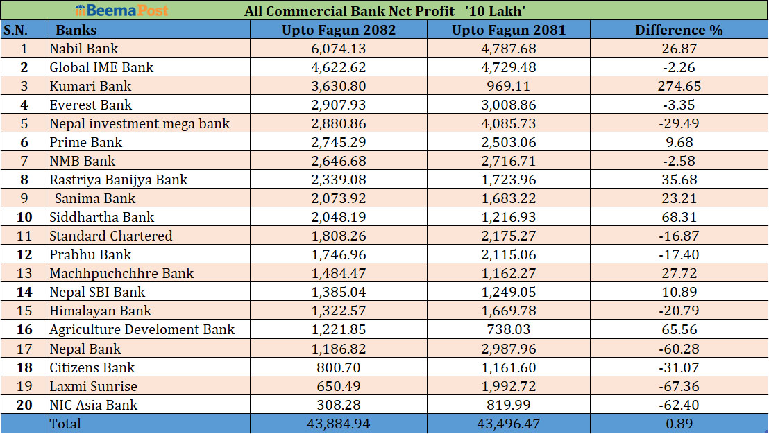 वाणिज्य बैंकको नाफा ४३ अर्ब ८८ करोड: नबिल अग्रस्थानमा हुँदा आक्रामक कुमारी, पुछारमा एनआईसी