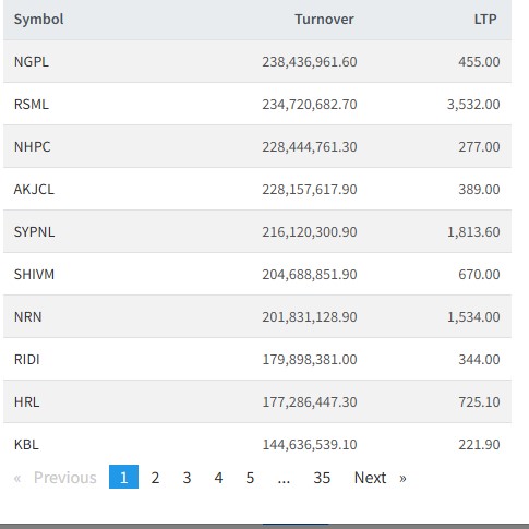 त्यस्तै, रिलायन्स स्पिङ्ग मिल्स, नेशनल हाईड्रोपावर, आँखु खोला, एसवाई प्यानल, शिवम सिमेन्टस्, एनआरएन इन्फ्रास्टक्चर, रिदि पावर, हिमालयन रि र कुमारी बैंकको आज सर्वाधिक कारोबार भएको छ।
