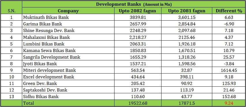 फागुन मसान्तसम्मको अवधिमा विकास बैंकले १९ अर्ब ५२ करोड २६ लाख रुपैयाँ शेयर धितो कर्जा प्रवाह गरेका छन् । उक्त कर्जा गत आर्थिक वर्षको सोही अवधिसम्मको तुलनामा ९.२४ प्रतिशत बढी हो ।