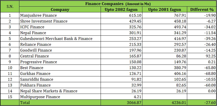 चालु आर्थिक वर्षको ८ महिनामा फाइनान्स कम्पनीहरुको शेयर धितो कर्जा भने २७.६० प्रतिशतले घटेर ३ अर्ब ६ करोड ६८ लाख रुपैयाँमा सिमित भएको छ । गत आर्थिक वर्षको सोहि अवधिमा फाइनान्सहरुले ४ अर्ब २३ करोड ६० लाख रुपैयाँ शेयर धितो कर्जा प्रवाह गरेका थिए ।
