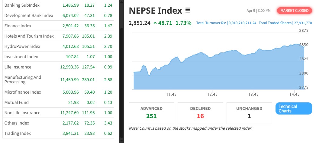 नेपाल स्टक एक्सचेञ्व (नेप्से) ४८.७१ अकंले बढेर २८५१.२४ बिन्दुमा कायम भएको छ । आज ३३८ कम्पनीको २ करोड ७९ लाख ३१ हजार कित्ता शेयर किनबेच हुँदा ९ अर्ब ९१ करोड ९२ लाख १० हजार रुपैयाँको कारोबार भएको हो ।