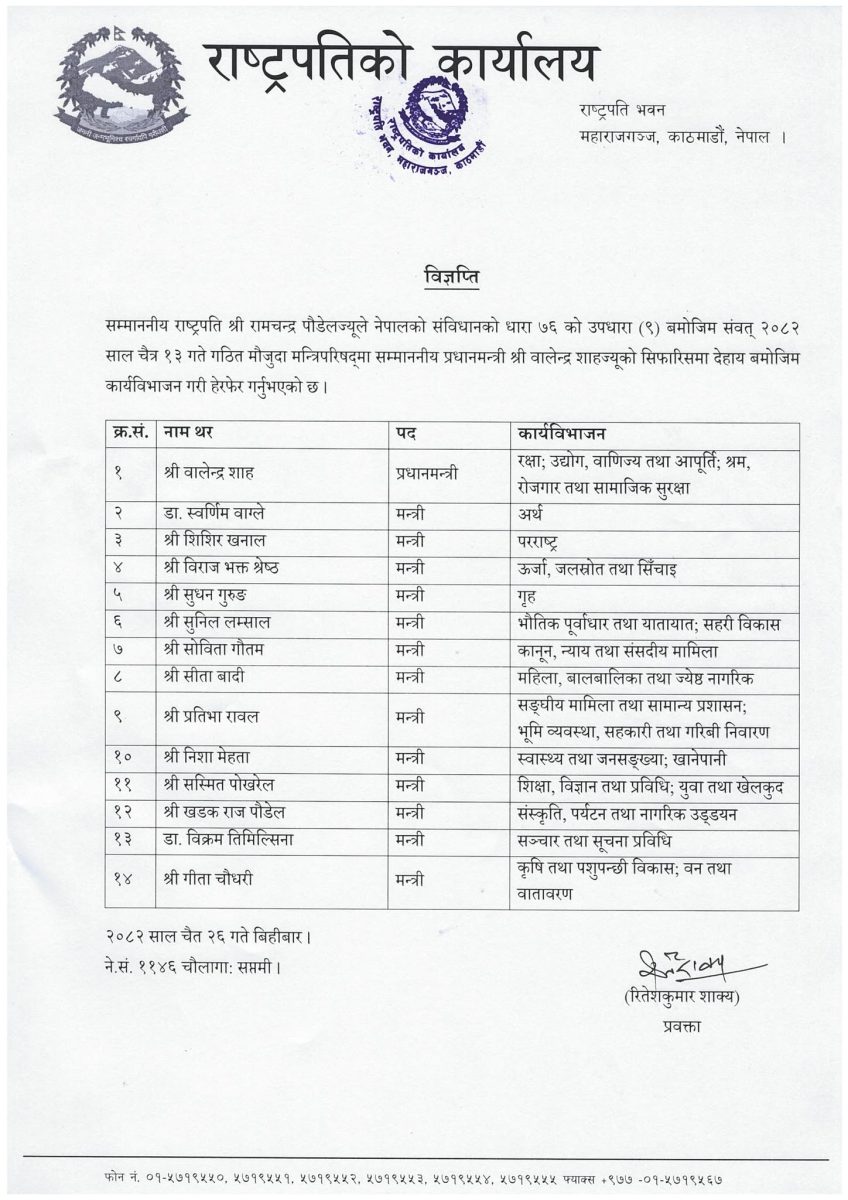 राष्ट्रपति कार्यालयले बिहीबार दिउँसो जारी गरेको विज्ञप्ति अनुसार प्रधानमन्त्रीले श्रम मन्त्रालयको कामकाज आफैं सञ्चालन गर्नेछन्। बाँकी मन्त्रीहरूको जिम्मेवारी भने यथावत् राखिएको छ।