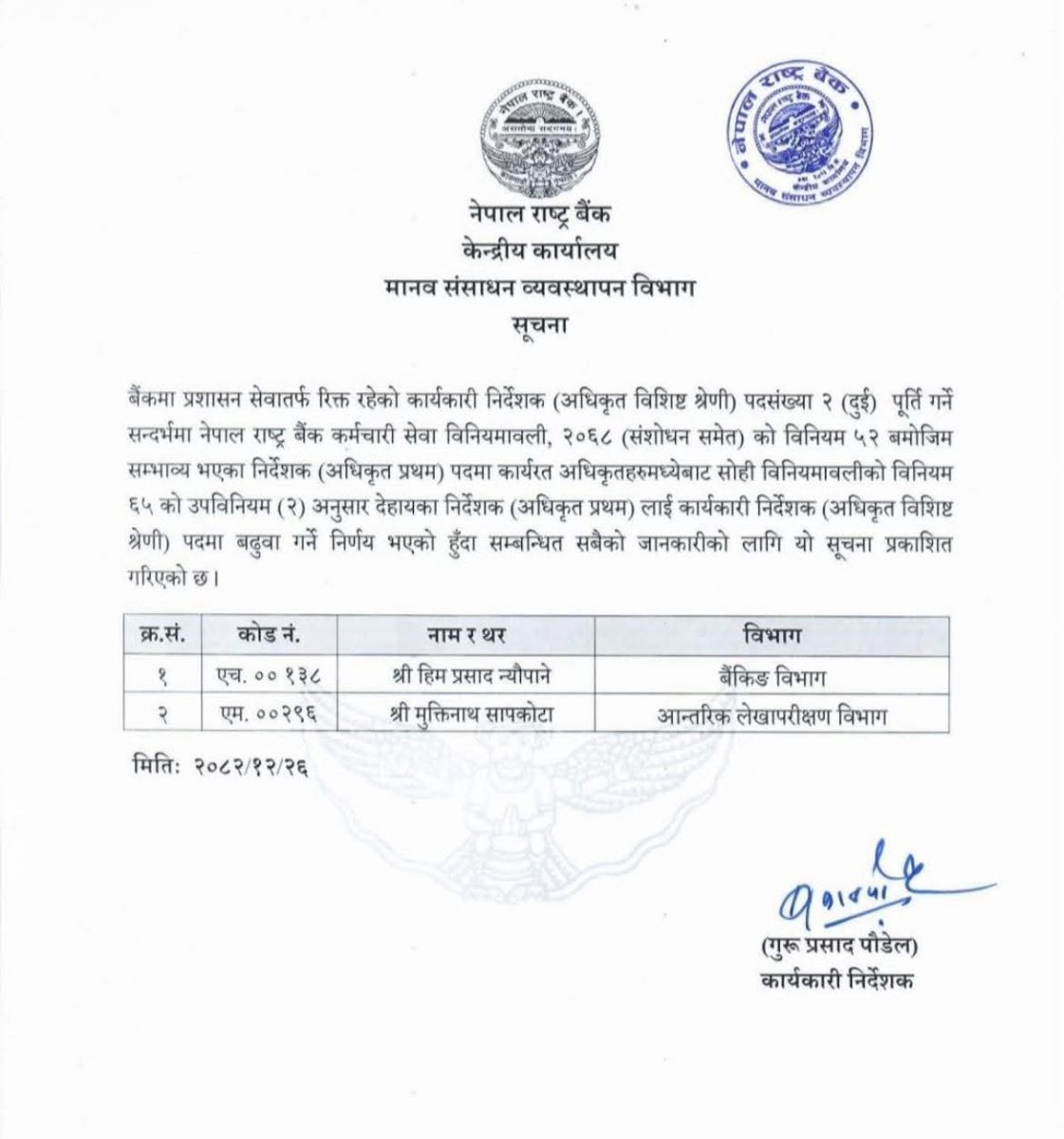 राष्ट्र बैंकले बैंकिङ विभागका हिमप्रसाद न्यौपाने र आन्तरिक लेखापरीक्षण विभागका मुक्तिनाथ सापकोटालाई कार्यकारी निर्देशक पदमा नियुक्त गरेको हो।