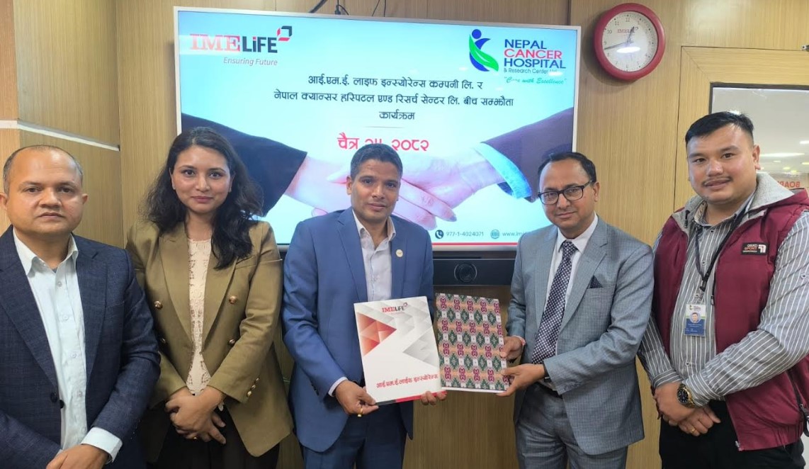 काठमाडौं । आइएमई लाइफ इन्स्योरेन्स कम्पनी र नेपाल क्यान्सर हस्पिटलबीच एक समझदारी पत्रमा हस्ताक्षर सम्पन्न भएको छ । यस सम्झौता बमेजिम इन्स्योरेन्स कम्पनीका बीमित, अभिकर्ता तथा कर्मचारीहरुलाई अब उपरान्त नेपाल क्यान्सर हस्पिटलमा उपचारसेवा लिंदा १० प्रतिशत छुट प्राप्त हुने भएको छ ।साथै, स्वास्थ्य सेवा प्याकेजमा विषेश सहुलियत दिने भएको छ ।