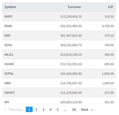 नेशनल हाईड्रोपावर,रिलायन्स स्पिङ्ग मिल्स, रिदि पावर, सेलु हाईड्रोपावर, आँखु खोला, शिवम् सिमेन्टस, एसवाई प्यानल, एनआरएन इन्फ्रास्टक्चर, हिमाल दोलखा र अपी पावरको सर्वाधिक कारोबार भएको छ।
