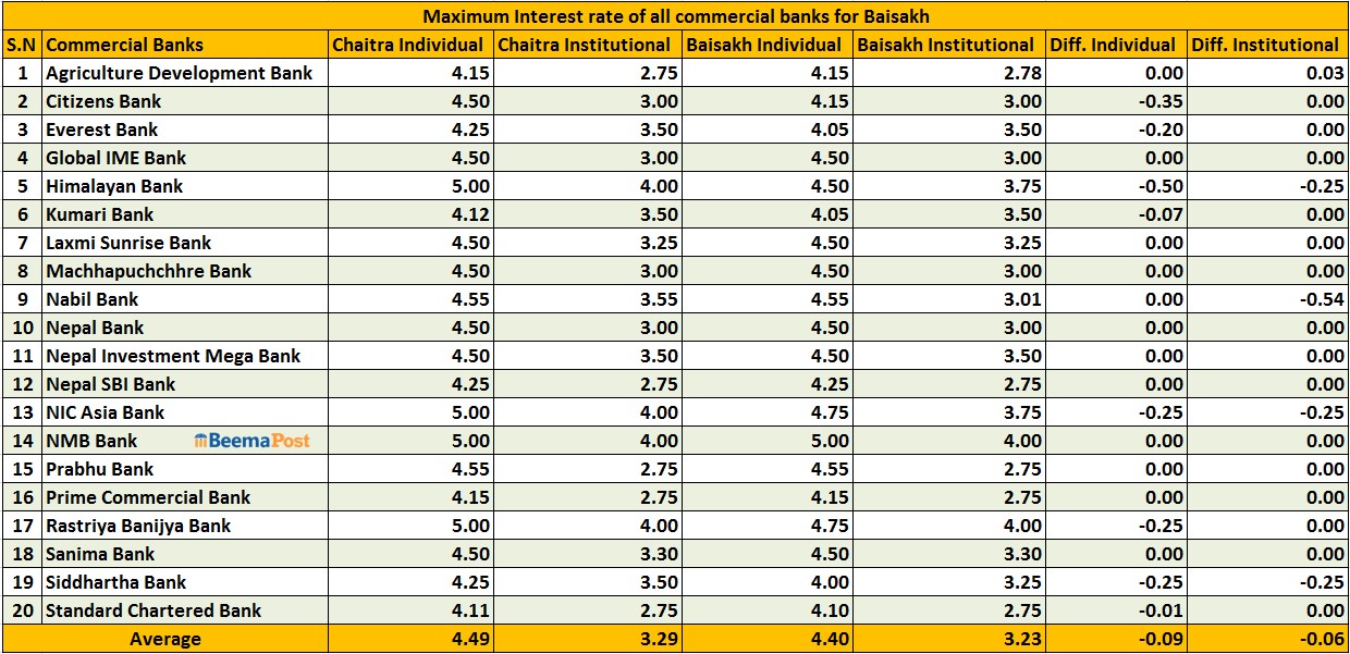 चैतमा व्यक्तिगत निक्षेपतर्फ औसत ब्याजदर ४.४९ प्रतिशत रहेकोमा वैशाखमा घटेर ४.४० प्रतिशतमा झरेको छ। त्यस्तै संस्थागत निक्षेपतर्फ चैतमा ३.२९ प्रतिशत रहेको औसत ब्याजदर वैशाखमा घटेर ३.२३ प्रतिशतमा सीमित भएको छ।