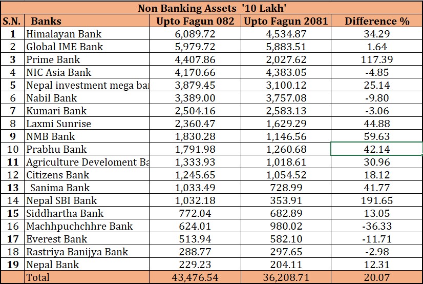 चालु आर्थिक वर्षको फागुन मसान्तसम्ममा आइपुग्दा बैंक तथा वित्तीय संस्थासँग ५१ अर्ब ३३ करोड रुपैयाँ गैरबैंकिङ सम्पत्ति पुगेको छ । गत आर्थिक वर्ष को फागुन मसान्तसम्म बैंक तथा वित्तीय संस्थाहरुको गैर बैंकिङ सम्पत्ति ४२ अर्ब ५ करोड रुपैयाँ थियो । एक वर्षको अवधिमा बैंक तथा वित्तीय संस्थाको गैरबैंकिङ सम्पत्ति ९ अर्ब २८ करोडले बढेको हो ।