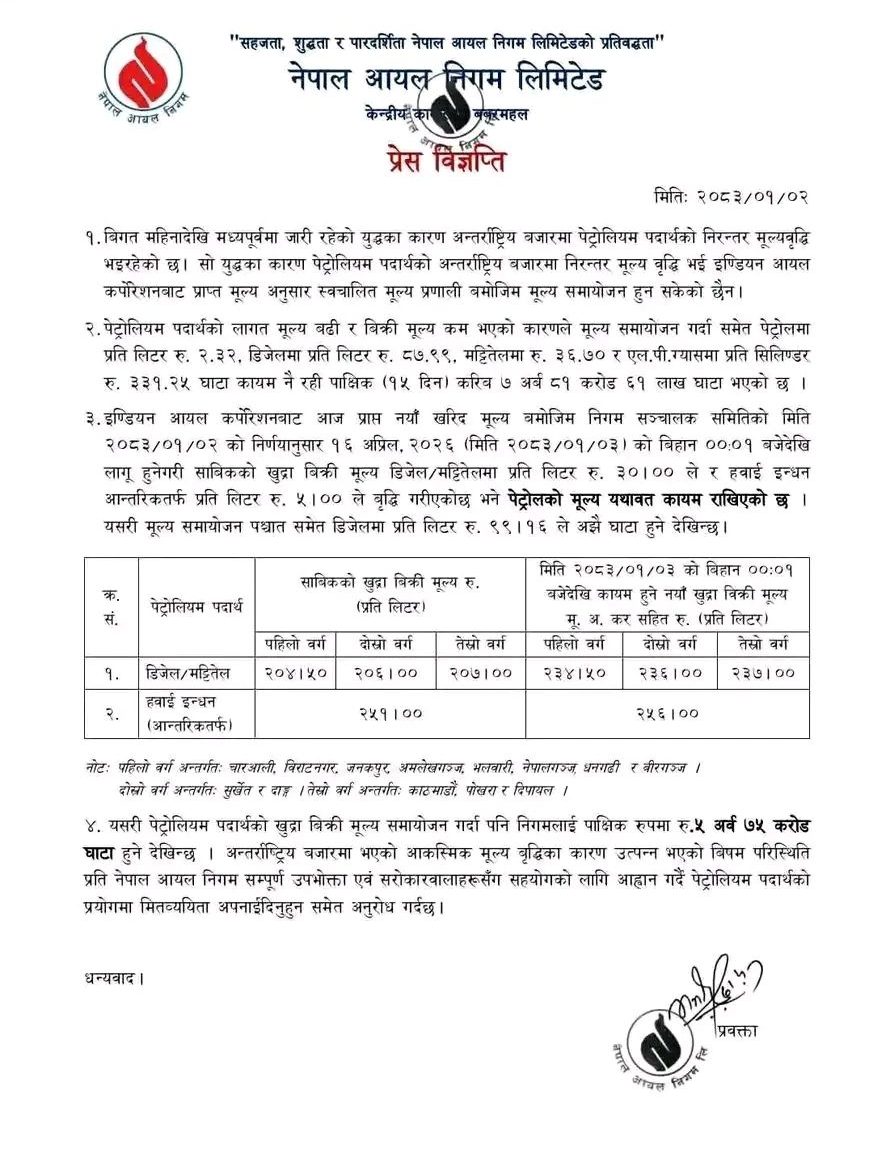 निगमका अनुसार मध्यपूर्वमा जारी युद्धका कारण अन्तर्राष्ट्रिय बजारमा पेट्रोलियम पदार्थको मूल्य निरन्तर बढिरहेको छ। सोही कारण इण्डियन आयल कर्पोरेशनबाट प्राप्त नयाँ खरीद मूल्यअनुसार स्वचालित मूल्य प्रणालीअनुसार पूर्ण रूपमा मूल्य समायोजन गर्न कठिन भएको जनाएको छ।