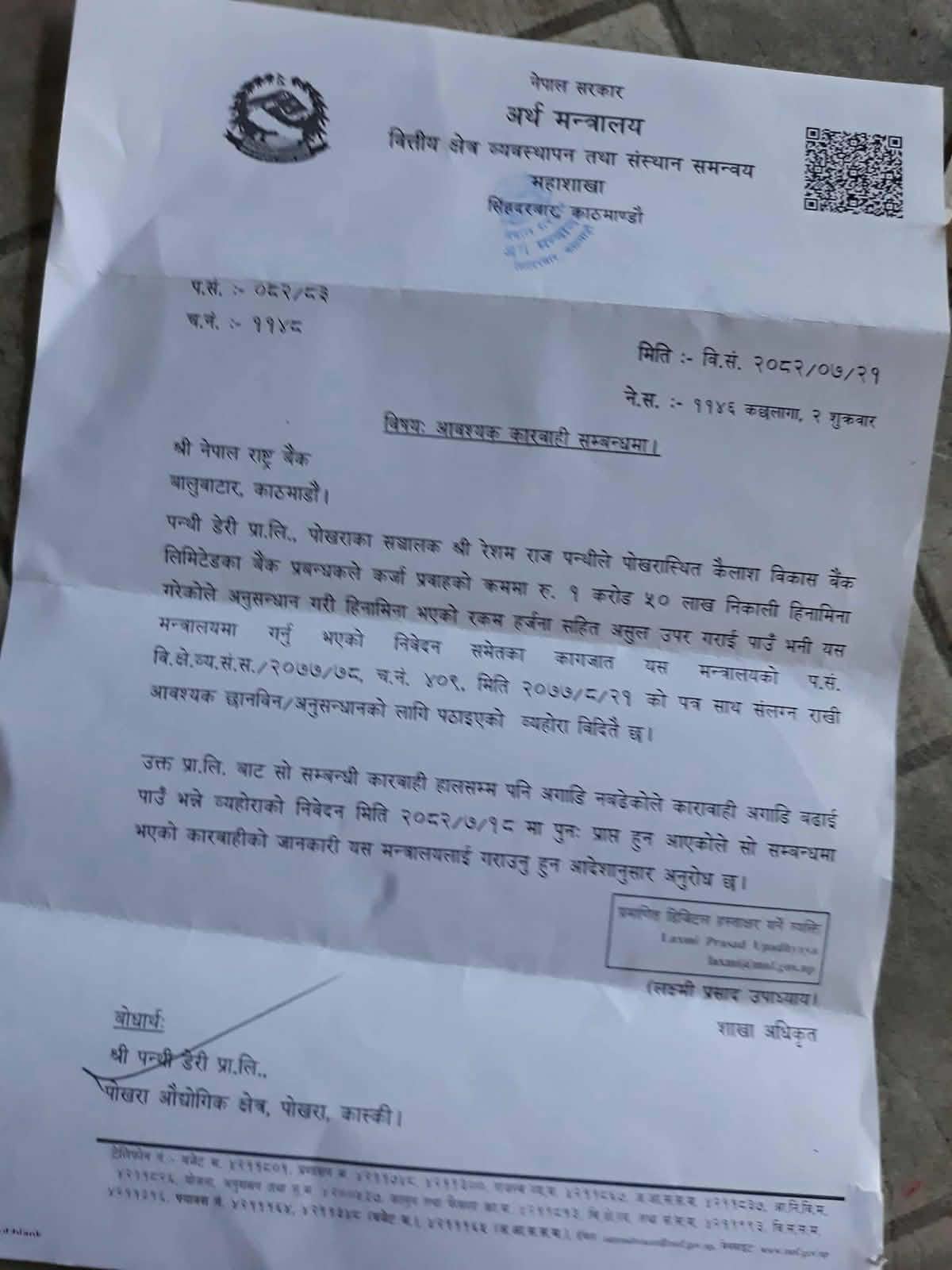 काठमाडौं । पोखरास्थित पन्थी डेरीमाथि प्राइम बैंकले गरेको अन्याय र अत्याचारमाथि छानविन गर्न अर्थमन्त्रालयले मिति २०७७।०८।२१ मा च.नं. ४०९ को पत्र नेपाल राष्ट्र बैंकलाई पठायो । उक्त पत्र कार्यान्वयन नभएपछि दोस्रो पत्र पाँच बर्षपछि मिति २०८२।०७।२१ मा पुनः पठायो ।