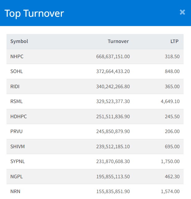 त्यसपछि सोलु हाइड्रोपावरको ३७ करोड २६ लाख रुपैयाँ, रिडी पावरको ३४ करोड २ लाख रुपैयाँ, रिलायन्स स्पिनिङ्ग मिल्सको ३२ करोड ९५ लाख रुपैयाँ, हिमाल दोलखा हाइड्रोपावरको २५ करोड १५ लाख रुपैयाँ र प्रभु बैंकको २४ करोड ५८ लाख रुपैयाँको शेयर खरीदबिक्री भएको छ।