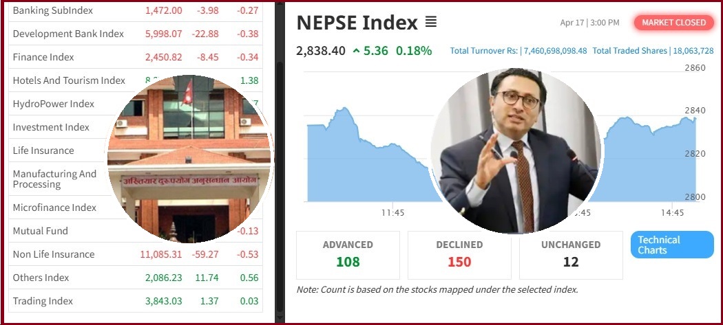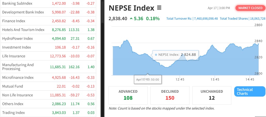 नेपाल स्टक एक्सचेञ्ज (नेप्से) ५.३६ अकंले बढेर २८३८.४० बिन्दुमा कायम भएको छ । ३३५ कम्पनीको १ करोड ८० लाख ६३ हजार कित्ता शेयर किनबेच हुँदा ७ अर्ब ४६ करोड ६ लाख रुपैयाँको कारोबार भएको हो ।