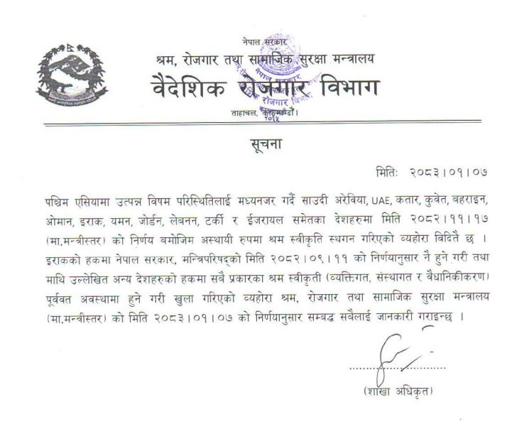 वैदेशिक रोजगार विभागले जारी गरेको सूचनामा इरान युद्धका कारण पश्चिम एसियाली क्षेत्रमा उत्पन्न अस्थिर परिस्थितिलाई मध्यनजर गर्दै फागुन १७ गते ती मुलुकहरूमा वैदेशिक रोजगारीमा जान अस्थायी रूपमा रोक लगाइएको उल्लेख गरिएको छ ।