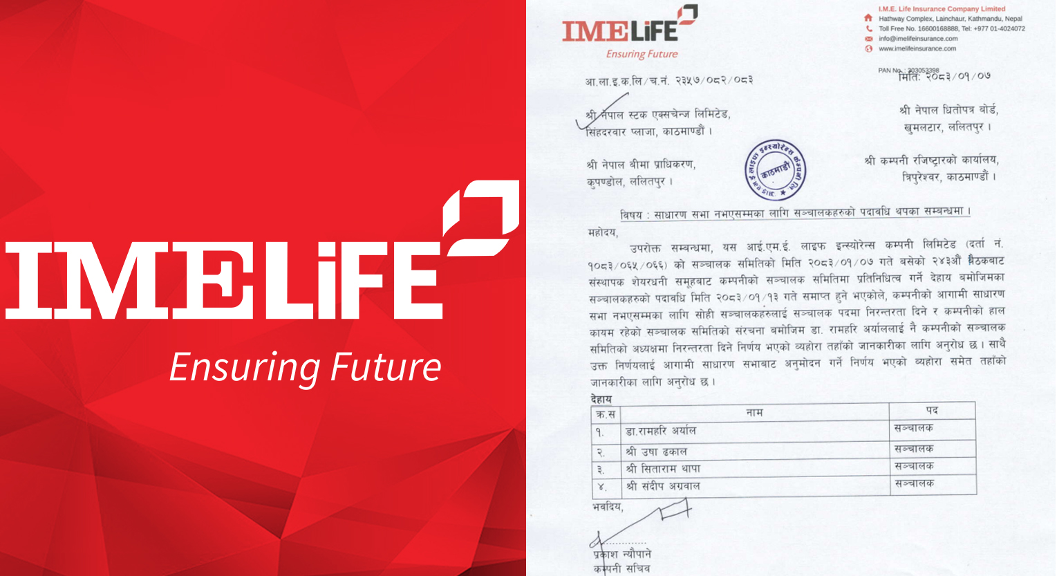 कम्पनीको सञ्चालक समितिको वैशाख ७ गते बसेको बैठकले डा. रामहरि अर्याल, उषा ढकाल, सिताराम थापा र संदीप अग्रवालको पदावधि आगामी वार्षिक साधारणसभा नभएसम्मका लागि थप गर्ने निर्णय गरेको हो।