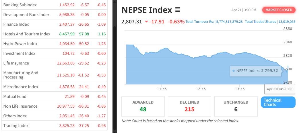 नेपाल स्टक एक्सचेञ्ज (नेप्से)ं १७.९१ अकंले घटेर २८०७.३१ बिन्दुमा कायम भएको छ । आ ३४७ कम्पनीको १ करोड ३० लाख १९ हजार कित्ता शेयर किनबेच हुँदा ५ अर्ब ७७ करोड ४३ लाख रुपैयाँको कारोबार भएको हो ।