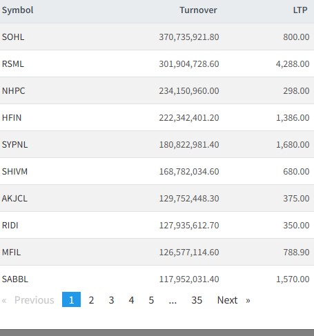 त्यस्तै, रिलायन्स स्पिङ्ग मिल्स, नेशनल हाईड्रोपावर, होटल फरेष्ट इन, एसवाई प्यानल, शिवम सिमेन्टस, मञ्जु श्री फाइनान्स, रिदि पावर, आखुँ खोला र साल्पा विकास बैंकको सर्वाधिक कारोबार भएको छ।