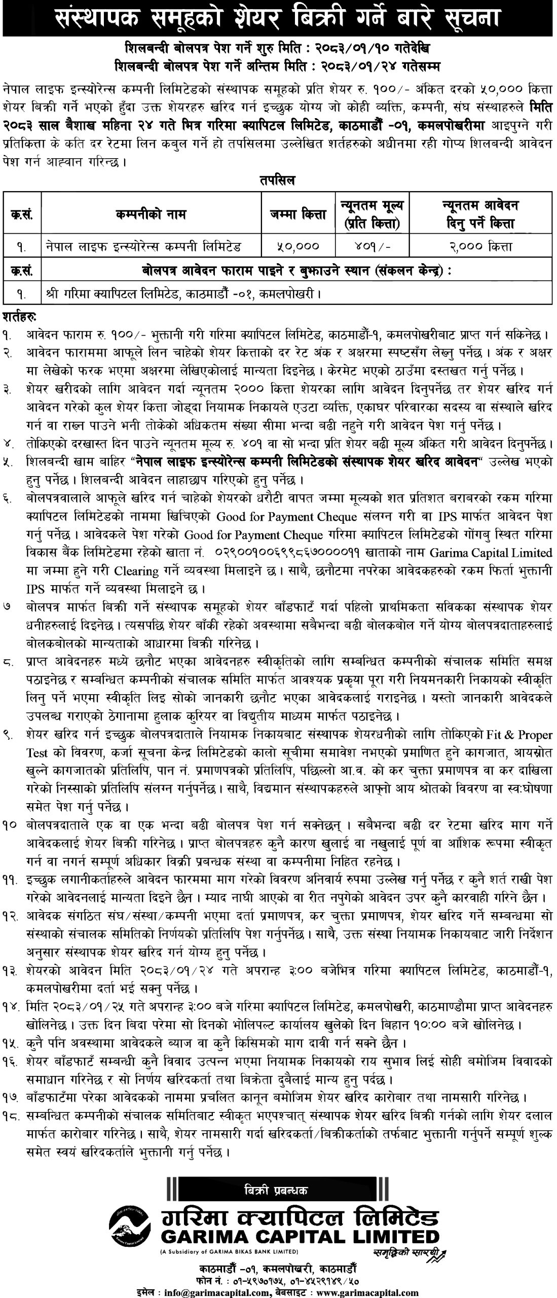 बोलपत्र आज वैशाख १० गतेदेखि वैशाख २४ गते बैंकिङ्ग समयभित्र पेश गरिसक्नु पर्नेछ। यस्तो बोलपत्र काठमाडौंको कमलपोखरीस्थित गरिमा क्यापिटल लिमिटेडको कार्यालयमा पाइनेछ भने सोही कार्यालयमा बुझाउन सकिनेछ।