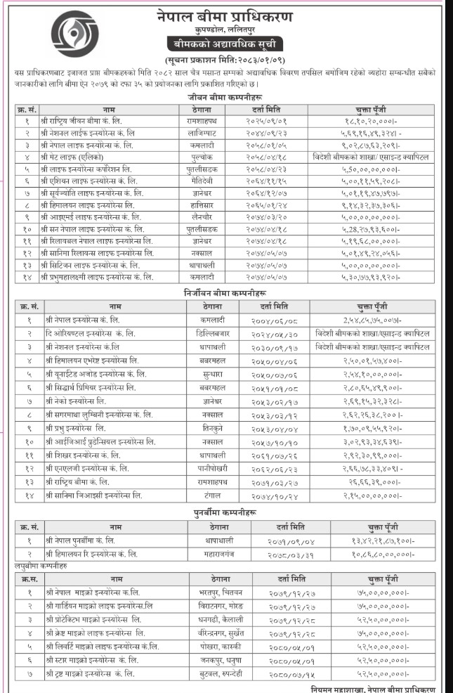 प्राधिकरणले चैत मसान्तसम्मको अद्यावधिक विवरणका आधारमा बीमा ऐन २०७९ को दफा ३५ बमोजिम सूची सार्वजनिक गरेको हो । प्राधिकरणका अनुसार देशभर १४ वटा जीवन बीमा कम्पनी रहेका छन् भने निर्जीवन कम्पनी पनि १४ वटै रहेका छन् ।