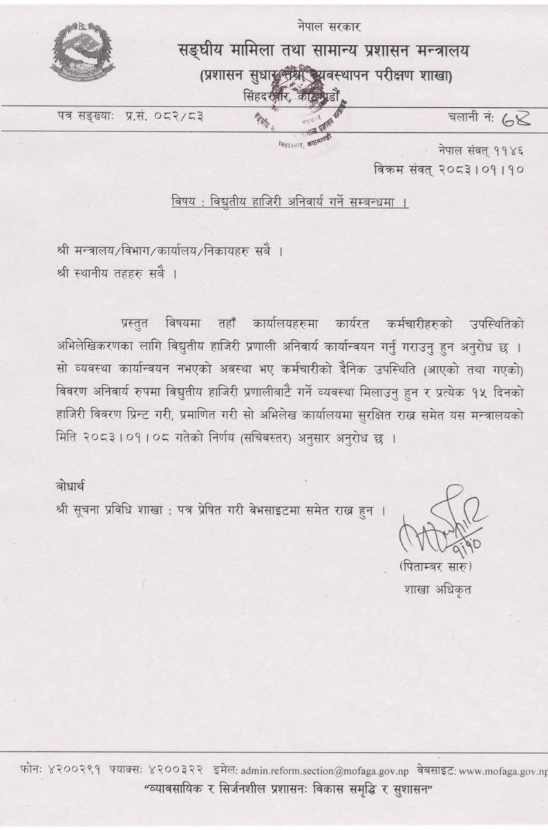 मन्त्रालयले सिंहदरबारबाट जारी गरेको परिपत्रमार्फत कर्मचारीहरूको उपस्थितिको अभिलेखलाई व्यवस्थित र पारदर्शी बनाउन सबै मन्त्रालय, विभाग, कार्यालय तथा स्थानीय तहलाई विद्युतीय हाजिरी प्रणाली प्रयोगमा ल्याउन आग्रह गरेको हो।
