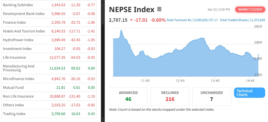बजारमा राताम्यले पायो निरन्तरः कारोबार खुम्चियो, होटल र निर्जीवन बीमा भारी गिरावट