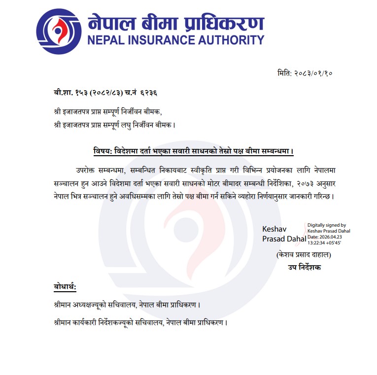 नेपाल बीमा प्राधिकरणले नेपालमा बस्ने अवधिसम्मको लागि तेस्रो पक्षको बीमा गर्न सकिने बाटो खुल्ला गरेको हो ।