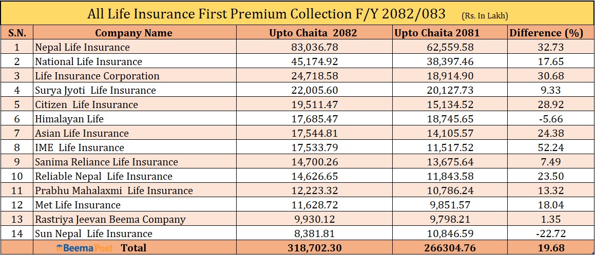 समीक्षा अवधिमा नेपाल लाइफ इन्स्योरेन्सको प्रथम बीमा शुल्क आर्जन ३२.७३ प्रतिशतले बृद्धि भएर ८ अर्ब ३० करोड ३६ लाख रुपैयाँ र दोस्रो स्थनामा रहेको रहेको नेशनल लाइफ इन्स्योरेन्सको सो बीमा शुल्क आर्जन १७.६५ प्रतिशतले बृद्धि भएर ४ अर्ब ५१ करोड ७४ लाख रुपैयाँ रहेको छ ।