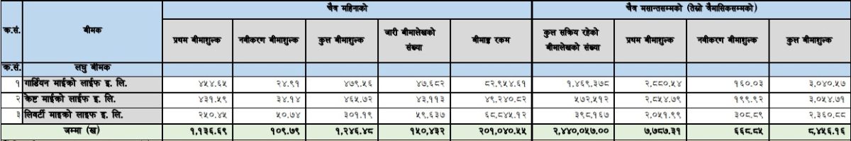 साथै, गार्डियन माइक्रो लाइफ इन्स्योरेन्सले ३० करोड ४० लाख रुपैयाँ र लिवर्टी माइक्रो लाइफ इन्स्योरेन्सले २३ करोड ६० लाख रुपैयाँ बराबरको बीमा शुल्क आर्जन गरेका छन् ।
