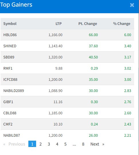 बजार घटेपनि केहि कम्पनीको शेयर मूल्य बढेको छ । आज हिमालयन बैंकको बन्ड २०८६, शाइन रेसुङ्गा डिबेन्चर, सानिमा डिबेन्चर, आरबिबि म्युचुल फण्ड १ र आइसिएफसि डिबेन्चर २०८८को शेयर मूल्य बढेको हो ।