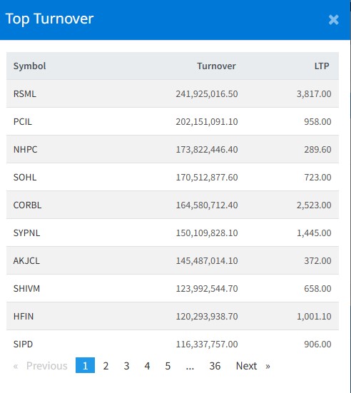 यसदिन रिलायन्स मिल्स र पाल्पा सिमेन्टको शेयर सर्वाधिक खरिदबिक्री भएको छ । साथै, सोलु हाइड्रोपावर, नेशनल हाइड्रो र एसवाई प्यानलको शेयर सर्वाधिक किनबेच भएको हो ।
