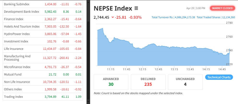 नेपाल स्टक एक्सचेञ्ज (नेप्से) २५.८१ अकंले घटेर २७४४.४५ बिन्दुमा कायम भएको छ । आज ३५१ कम्पनीको १ करोड २१ लाख ३४ हजार कित्ता शेयर किनबेच हुँदा ४ अर्ब ९८ करोड ६२ लाख रुपैयाँको कारोबार भएको हो ।