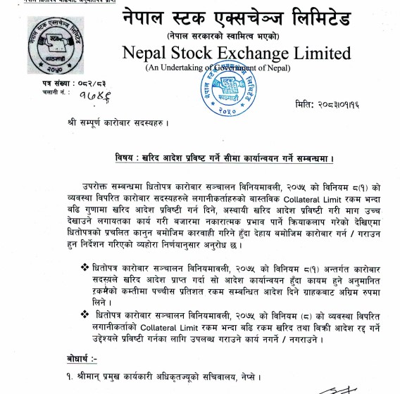 नेप्सेले जारी गरेको पत्रमा धितोपत्र कारोबार सञ्चालन विनियमावली, २०७५ को विनियम ८ (१) को व्यवस्था विपरीत कार्य गरेको पाइएमा प्रचलित कानुनअनुसार कारबाही गरिने स्पष्ट चेतावनी दिइएको छ। विशेषगरी केही ब्रोकरहरूले लगानीकर्ताको वास्तविक कोलेटरल लिमिटभन्दा बढी रकम बराबरको खरिद आदेश प्रविष्ट गर्न दिने तथा पछि रद्द गर्ने उद्देश्यले अस्थायी आदेश राख्ने प्रवृत्ति देखिएकाले त्यसलाई तत्काल रोक्न निर्देशन दिइएको हो।