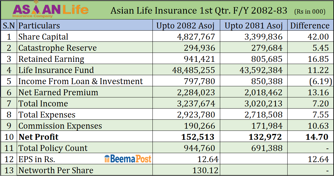 एशियन लाइफको मुनाफा १४.७० प्रतिशतले बढ्यो, अधिकांश सूचकमा उल्लेख्य प्रगति