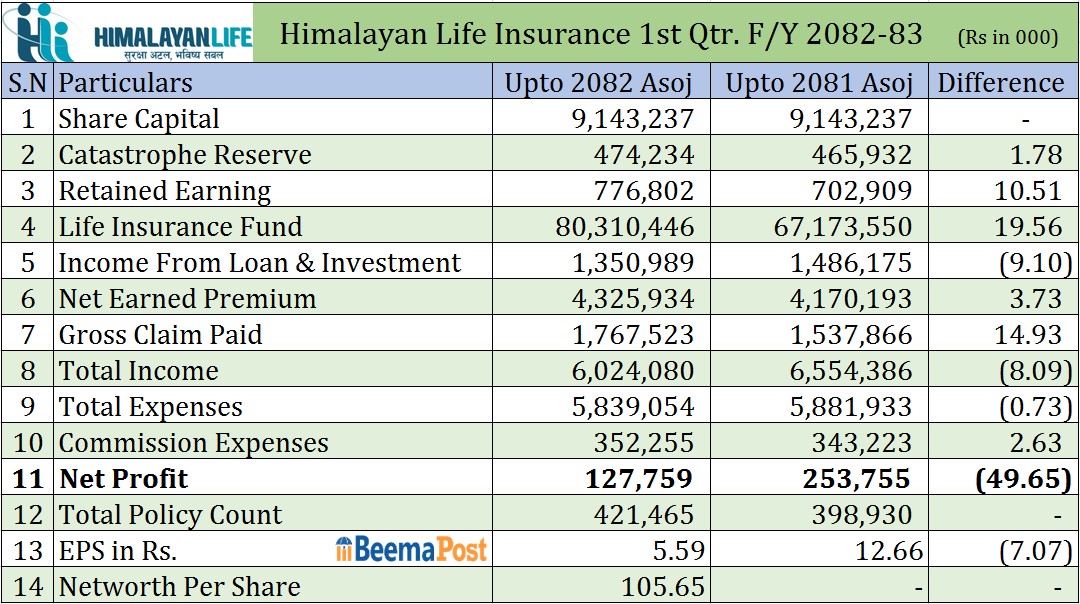 हिमालयन लाइफले प्रथम त्रैमासमा कमायो १२ करोड ७७ लाख रुपैयाँ नाफा, अन्य सूचक कस्तो?