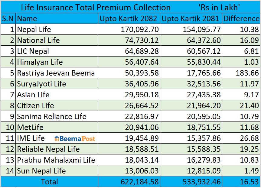 जीवन बीमकको नवीकरण बीमाशुल्क आर्जन १६ प्रतिशतले बढ्यो, कुन कम्पनीको कति?