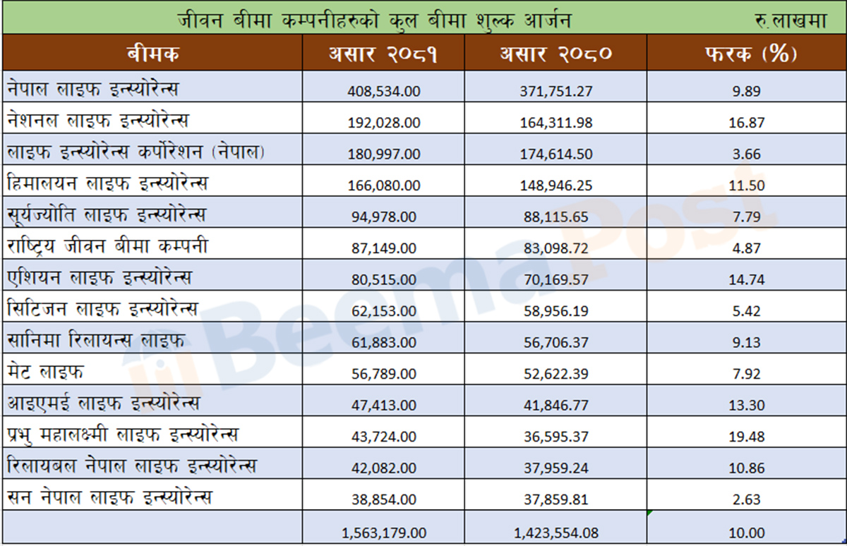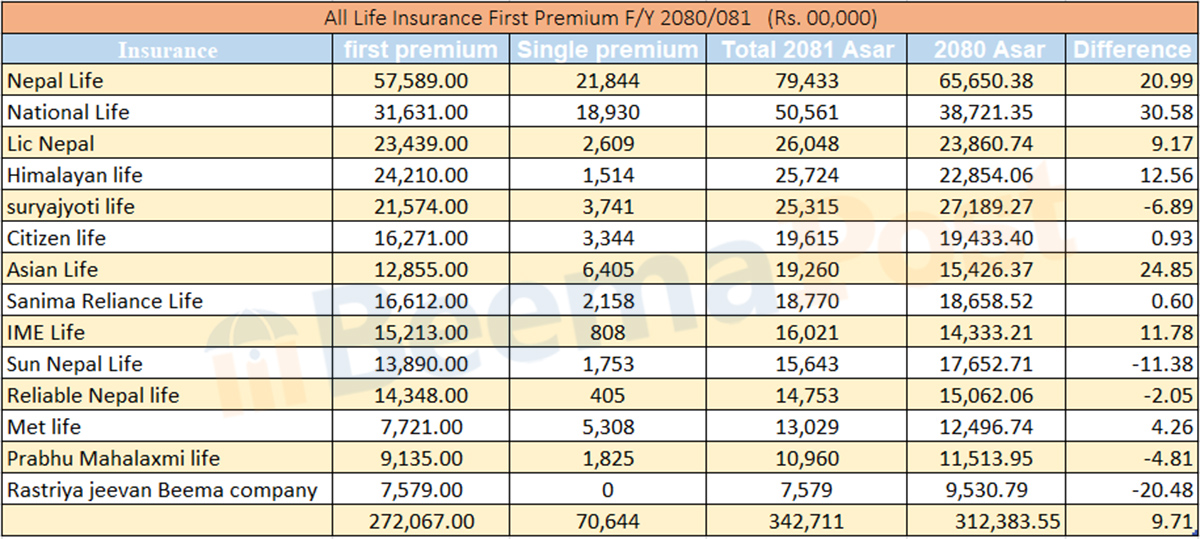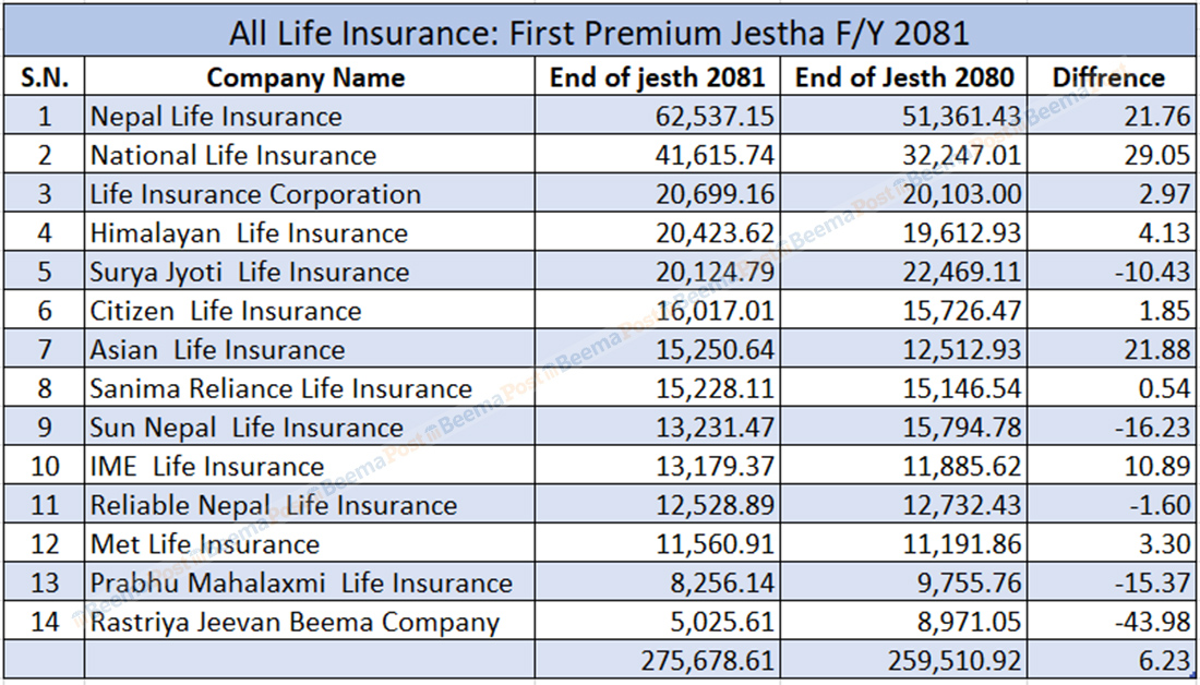बैशाखको तुलनामा २०% ले बढ्यो जीवन बीमा कम्पनीको प्रथम बीमा शुल्क, एलआईसी र एशियनको उच्च वृद्धि (तथ्यांकसहित)