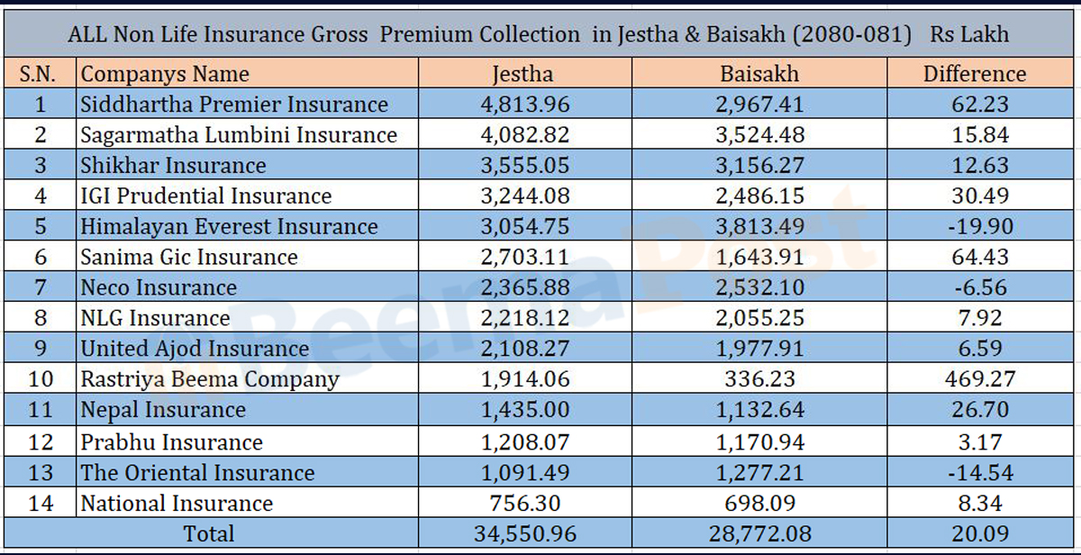 जेठ महिनामा निर्जीवन बीमा ब्यवसाय ह्वातै बढ्यो, सिद्धार्थ प्रिमियर नम्बर १ मा, अन्यको अवस्था कस्तो ?