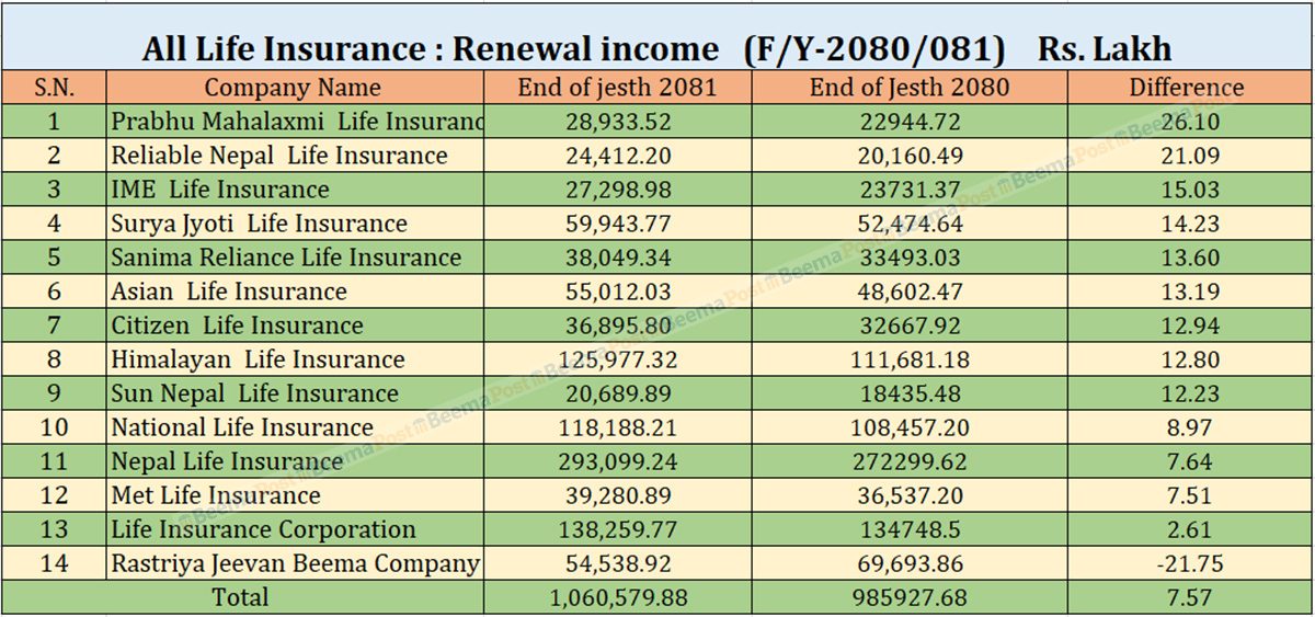 जीवन बीमा कम्पनीहरुको नविकरण बीमाशुल्क आर्जन ८ % ले बढ्यो, प्रभु महालक्ष्मी–रिलायबल र आइएमईको सर्वाधिक वृद्धि (सूचीसहित)