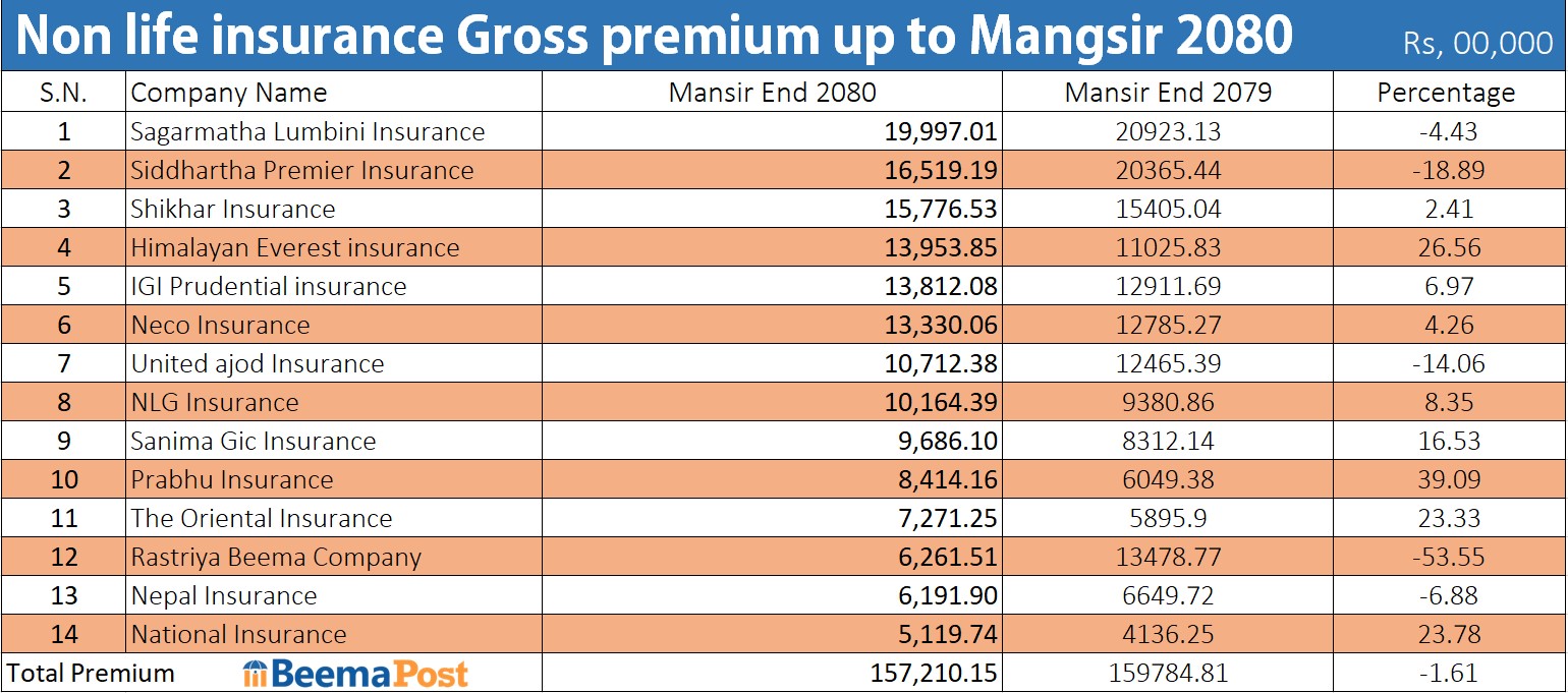 तीन महिनामा बीमा कम्पनीहरुको प्रथम बीमा शुल्क पाँच प्रतिशतले घट्यो, सूर्यज्योतिको ३०% ले गिरावट, अन्य कुनको कति ? (सूचीसहित)
