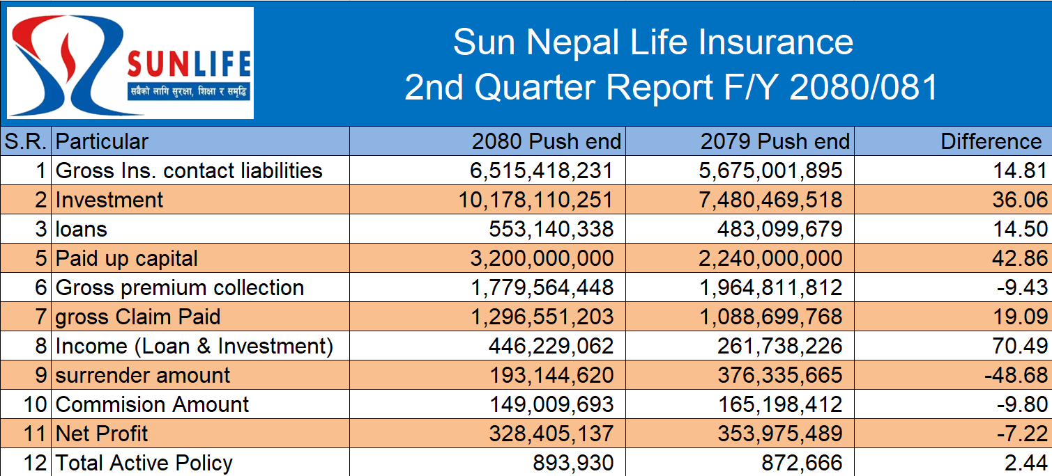 दोस्रो त्रैमासमा सन नेपाल लाइफको उल्लेख्य प्रगति, साढे छ अर्बको जीवन बीमा कोष, इपिएस २०.५२ रुपैयाँ