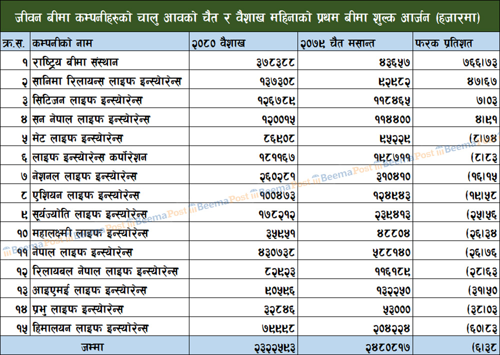 वैशाखमा मात्रै जीवन बीमा कम्पनीहरुले नयाँ व्यवसायमार्फत भित्र्याए २ अर्ब ३२ करोड, चार कम्पनीको व्यवसायमा मात्रै सुधार