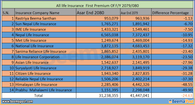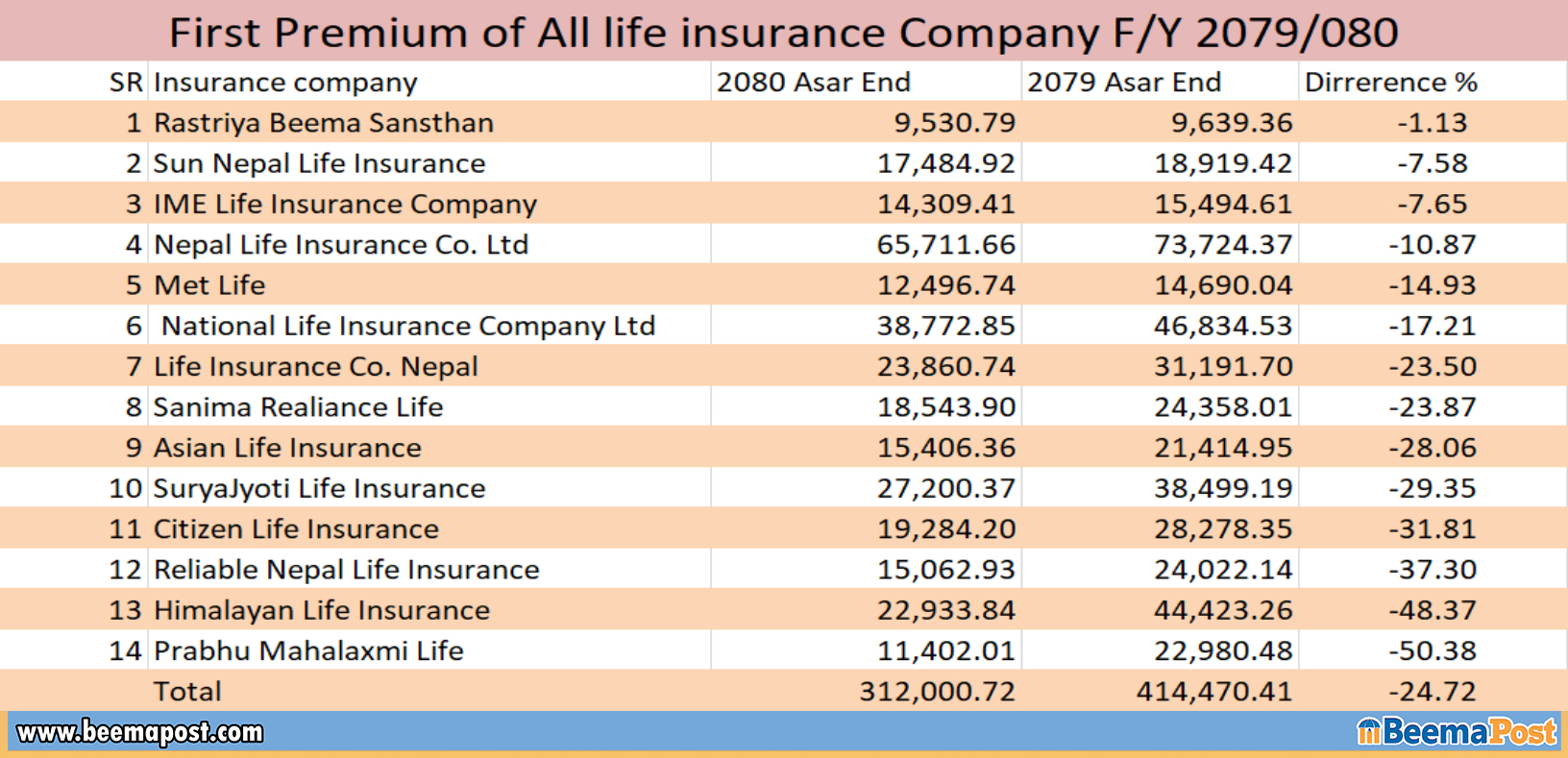 जीवन बीमा कम्पनीहरुले नयाँ बीमामा आकर्षण बढाउन सकेनन्, प्रथम बीमाशुल्क करिब २४ प्रतिशतले घट्यो, कुनको कतिले घट्यो ? (तथ्यांकसहित)