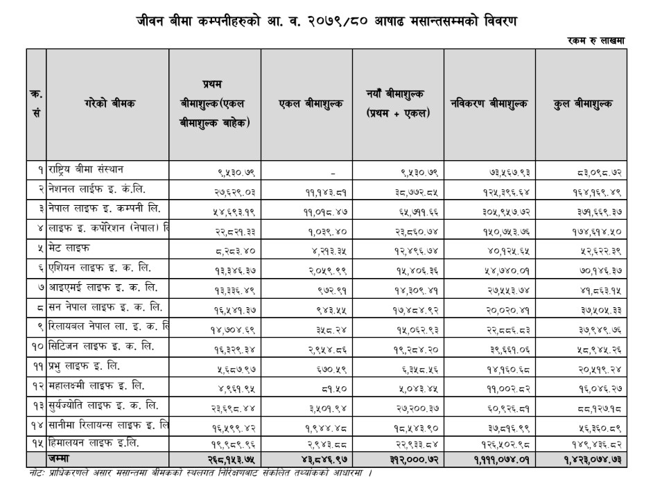 गत आर्थिक वर्षमा जीवन बीमा कम्पनीहरुको कुल बीमा शुल्क आम्दानी एक खर्ब ४२ अर्बमाथि, ३७ अर्बसहित नेपाल लाइफ सबैभन्दा अगाडि