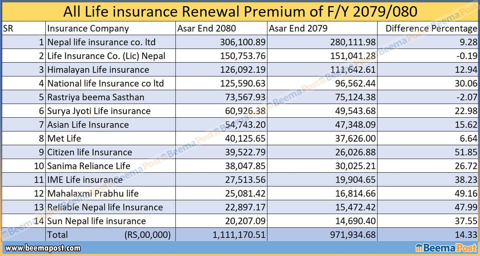 जीवन बीमा कम्पनीहरुको नवीकरण बीमा शुल्क १४ प्रतिशत बृद्धि, सिटिजन लाइफ र महालक्ष्मी प्रभुको बृद्धिदर सबैभन्दा धेरै