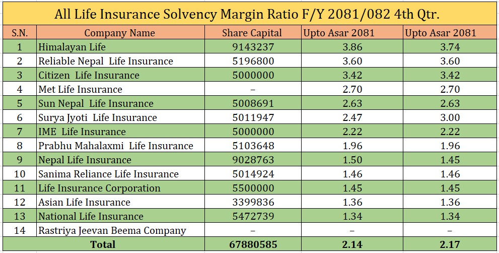 जीवन बीमा कम्पनीको सोल्भेन्सी रेसियो अनुपात २.१४, हिमालयन र रिलायबलको जोखिम धारण क्षमता उच्च