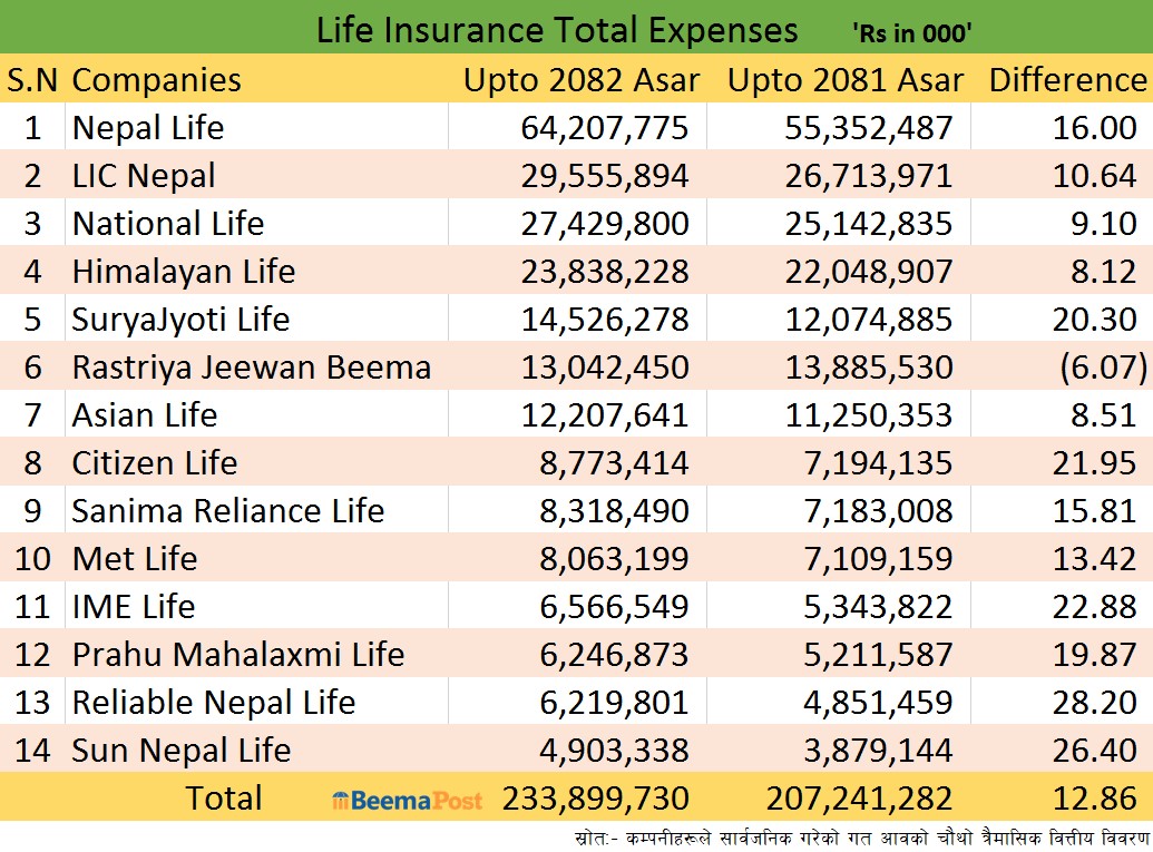 जीवन बीमा कम्पनीहरूले वर्षदिनमा खर्चिए २ खर्ब ३३ अर्ब रुपैयाँ, कुन कम्पनीको खर्च कति?